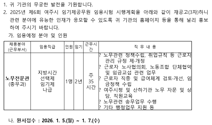 2025년 제6회 여주시 지방임기제공무원 임용시험 재공고(3차) 홍보