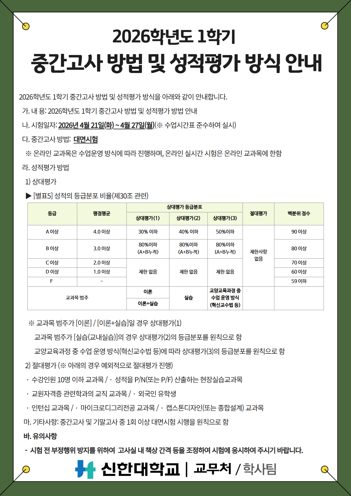 [학사팀/시험] 2026학년도 1학기 중간고사 방법 및 성적평가 방식 안내
