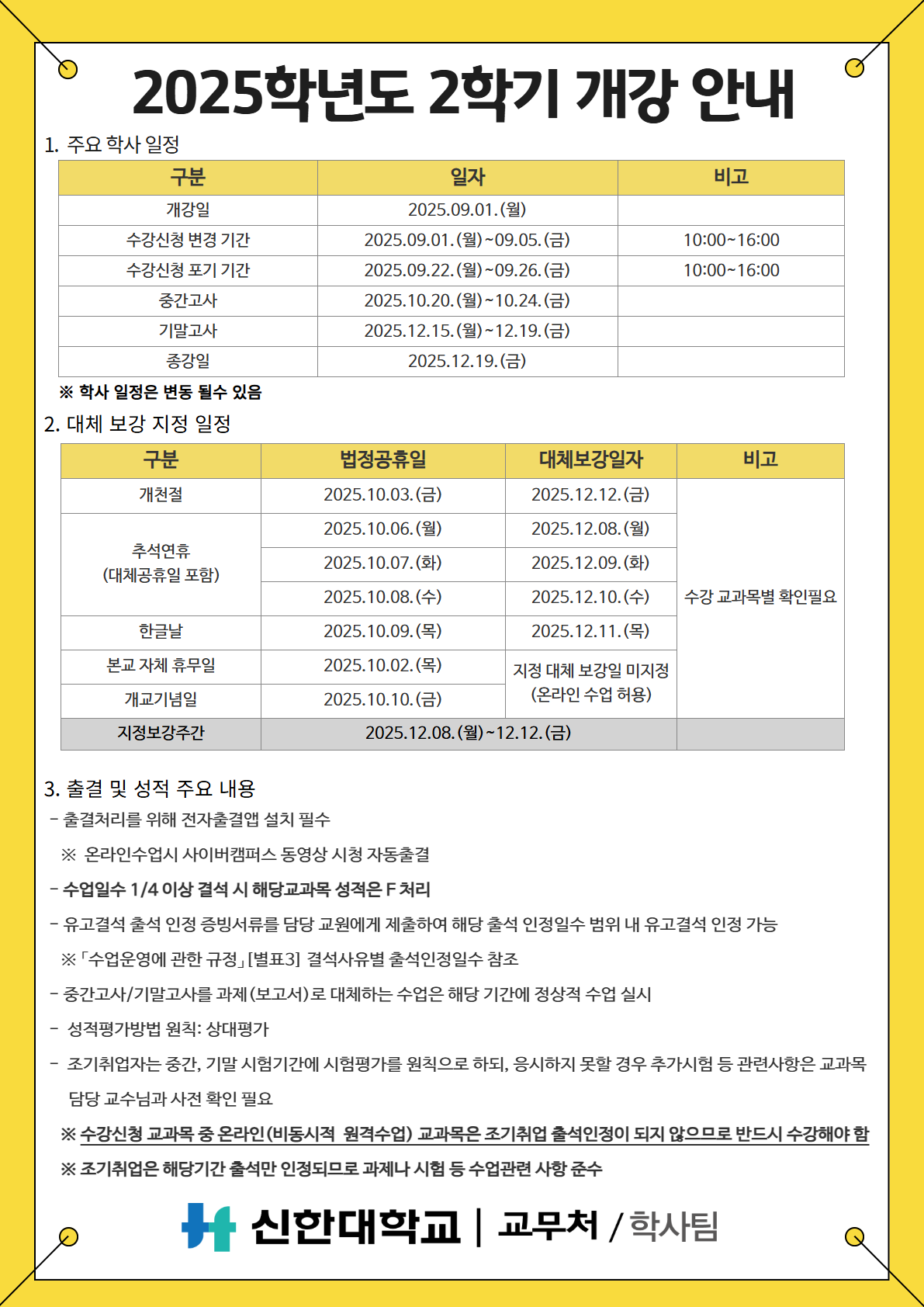 [수업] 2025학년도 2학기 개강 관련 일정 안내
